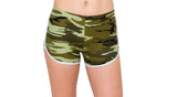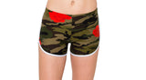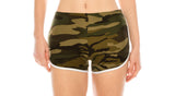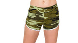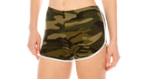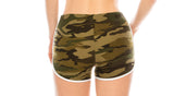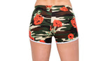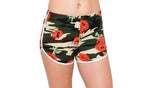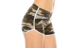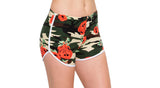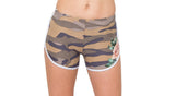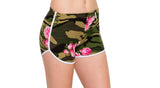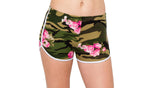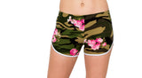 - DESIGN - Mid rise with elastic waistband, all over floral camo print dolphin style, white stripe outseam and hem.